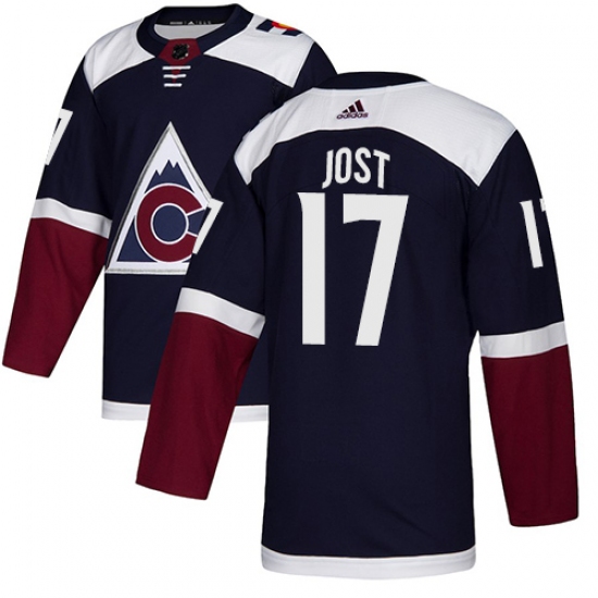 >Men's Adidas Colorado Avalanche #17 Tyson Jost Premier Navy Blue Alternate NHL Jersey