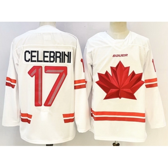 >Men's Canada Hockey #17 Macklin Celebrini White Stitched Jersey