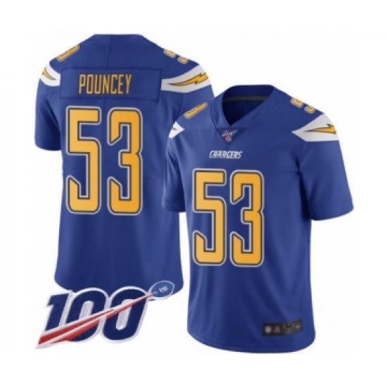 >Men's Los Angeles Chargers #53 Mike Pouncey Limited Electric Blue Rush Vapor Untouchable 100th Season Football Jersey