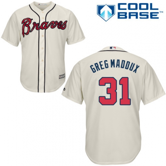 Home>MLB>Atlanta Braves>Greg Maddux>Men's Majestic Atlanta Braves #31 Greg Maddux Replica Cream Alternate 2 Cool Base MLB Jersey