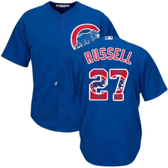 Home>MLB>Chicago Cubs>Addison Russell>Men's Majestic Chicago Cubs #27 Addison Russell Authentic Royal Blue Team Logo Fashion Cool Base MLB Jersey