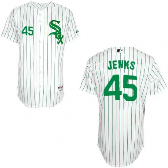 Men's Majestic Chicago White Sox #45 Bobby Jenks Replica White/Green Strip MLB Jersey