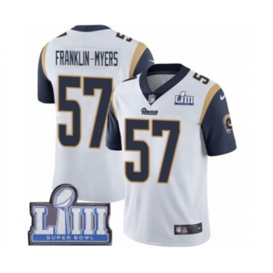 >Men's Nike Los Angeles Rams #57 John Franklin-Myers White Vapor Untouchable Limited Player Super Bowl LIII Bound NFL Jersey