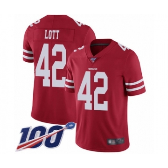 >Men's San Francisco 49ers #42 Ronnie Lott Red Team Color Vapor Untouchable Limited Player 100th Season Football Jersey