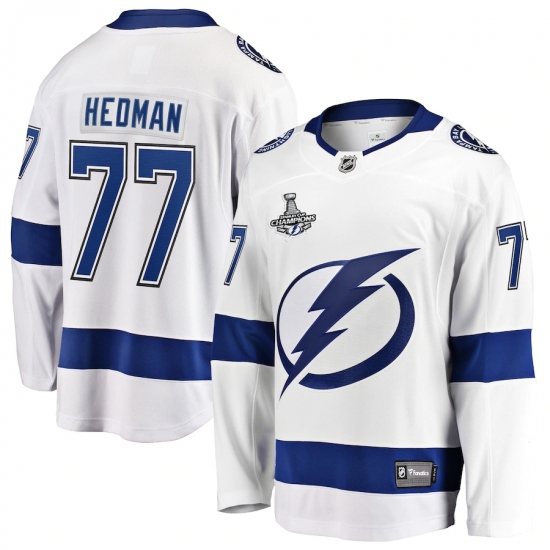 >Men's Tampa Bay Lightning #77 Victor Hedman Fanatics Branded White Away 2020 Stanley Cup Champions Breakaway Jersey