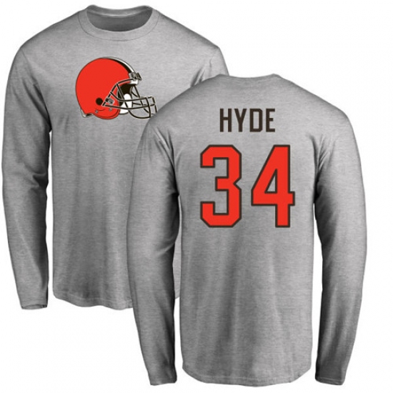 NFL Nike Cleveland Browns #34 Carlos Hyde Ash Name & Number Logo Long Sleeve T-Shirt