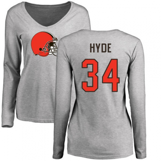 >NFL Women's Nike Cleveland Browns #34 Carlos Hyde Ash Name & Number Logo Long Sleeve T-Shirt
