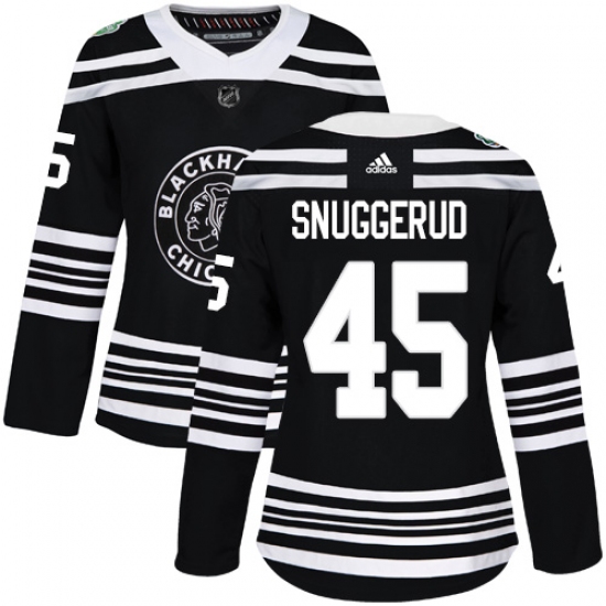 >Women's Adidas Chicago Blackhawks #45 Luc Snuggerud Authentic Black 2019 Winter Classic NHL Jersey