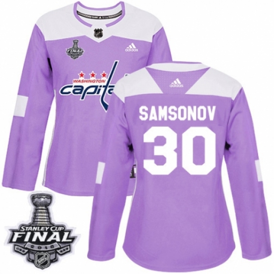 >Women's Adidas Washington Capitals #30 Ilya Samsonov Authentic Purple Fights Cancer Practice 2018 Stanley Cup Final NHL Jersey