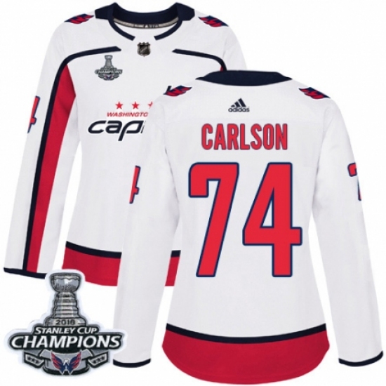 Women's Adidas Washington Capitals #74 John Carlson Authentic White Away 2018 Stanley Cup Final Champions NHL Jersey