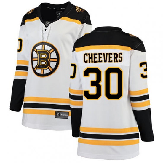 Home>NHL>Boston Bruins>Gerry Cheevers>Women's Boston Bruins #30 Gerry Cheevers Authentic White Away Fanatics Branded Breakaway NHL Jersey