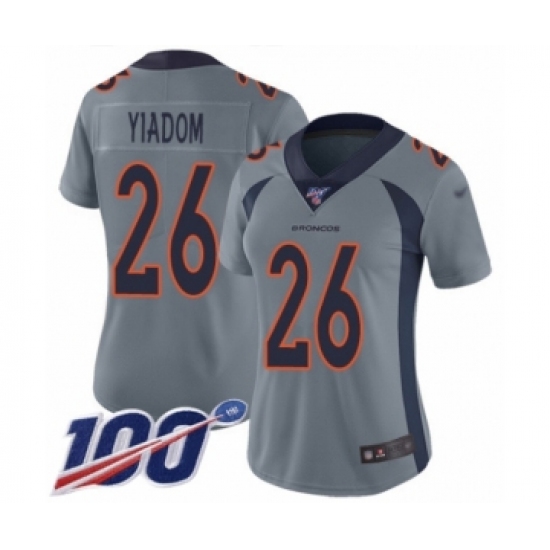 >Women's Denver Broncos #26 Isaac Yiadom Limited Silver Inverted Legend 100th Season Football Jersey