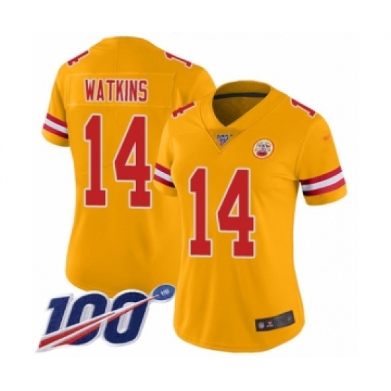 >Women's Kansas City Chiefs #14 Sammy Watkins Limited Gold Inverted Legend 100th Season Football Jersey