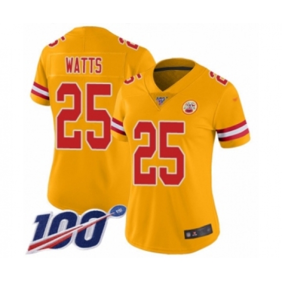 >Women's Kansas City Chiefs #25 Armani Watts Limited Gold Inverted Legend 100th Season Football Jersey