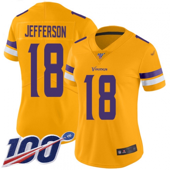 Women's Minnesota Vikings #18 Justin Jefferson Gold Stitched NFL Limited Inverted Legend 100th Season Jersey