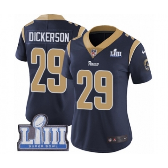 >Women's Nike Los Angeles Rams #29 Eric Dickerson Navy Blue Team Color Vapor Untouchable Limited Player Super Bowl LIII Bound NFL Jersey