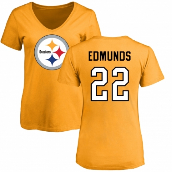 >Women's Nike Pittsburgh Steelers #22 Terrell Edmunds Gold Name & Number Logo Slim Fit T-Shirt