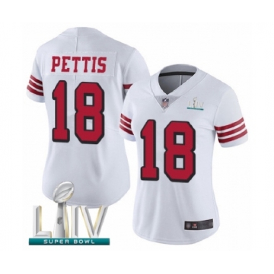 >Women's San Francisco 49ers #18 Dante Pettis Limited White Rush Vapor Untouchable Super Bowl LIV Bound Football Jersey