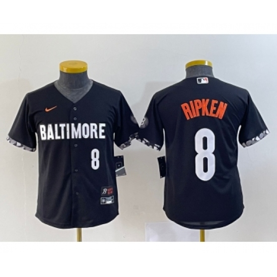 >Youth Baltimore Orioles #8 Cal Ripken Jr Number Black 2023 City Connect Cool Base Stitched Jersey 1