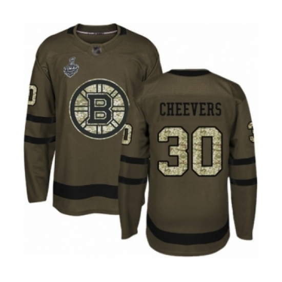 >Youth Boston Bruins #30 Gerry Cheevers Authentic Green Salute to Service 2019 Stanley Cup Final Bound Hockey Jersey