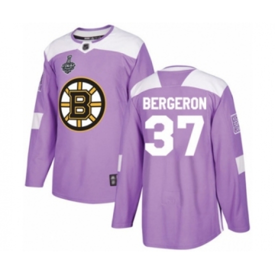 >Youth Boston Bruins #37 Patrice Bergeron Authentic Purple Fights Cancer Practice 2019 Stanley Cup Final Bound Hockey Jersey
