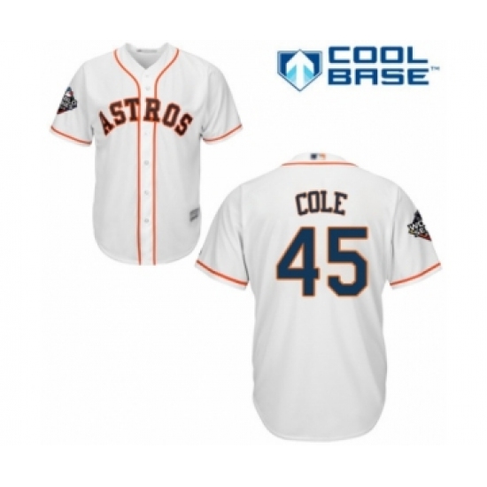 >Youth Houston Astros #45 Gerrit Cole Authentic White Home Cool Base 2019 World Series Bound Baseball Jersey