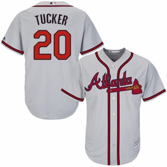 >Youth Majestic Atlanta Braves #20 Preston Tucker Replica Grey Road Cool Base MLB Jersey