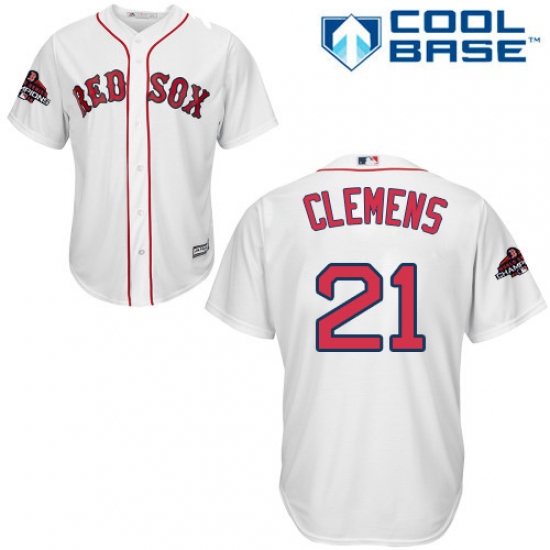 >Youth Majestic Boston Red Sox #21 Roger Clemens Authentic White Home Cool Base 2018 World Series Champions MLB Jersey