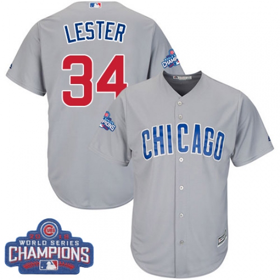 Youth Majestic Chicago Cubs #34 Jon Lester Authentic Grey Road 2016 World Series Champions Cool Base MLB Jersey