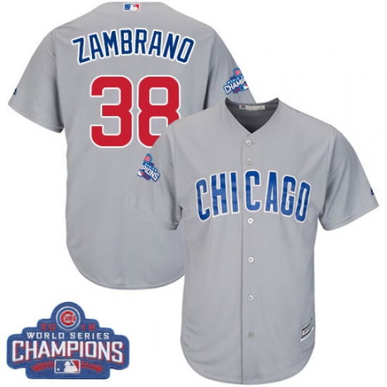 Home>MLB>Chicago Cubs>Carlos Zambrano>Youth Majestic Chicago Cubs #38 Carlos Zambrano Authentic Grey Road 2016 World Series Champions Cool Base MLB Jersey