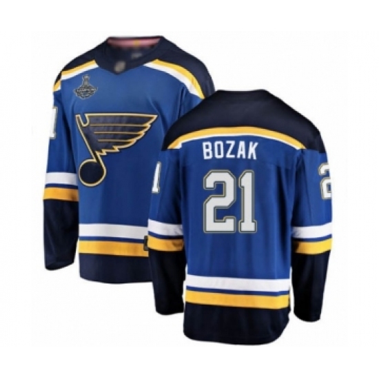 >Youth St. Louis Blues #21 Tyler Bozak Fanatics Branded Royal Blue Home Breakaway 2019 Stanley Cup Champions Hockey Jersey